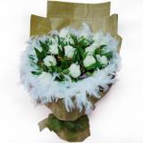 简介:白玫瑰19枝,白色羽毛外围,配叶点缀,内衬粉...